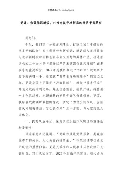 【七哥公文】2025年:【七哥公文】党课:加强作风建设,打造忠诚干净担当的党员干部队伍+更多免费公文+VX:QiGeGongWen2024+更多免费公文+VX:QiGeGongWen2024