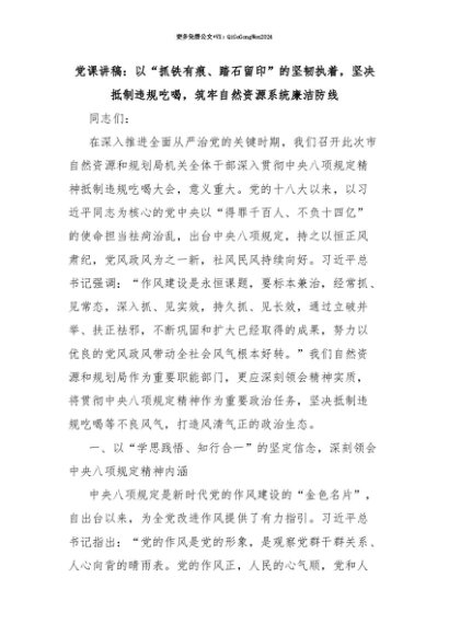 【七哥公文】2025年:【七哥公文】党课讲稿:以“抓铁有痕、踏石留印”的坚韧执着,坚决抵制违规吃喝,筑牢自然资源系统廉洁防线+更多免费公文+VX:QiGeGongWen2024+更多免费公文+VX:QiGeGongWen2024