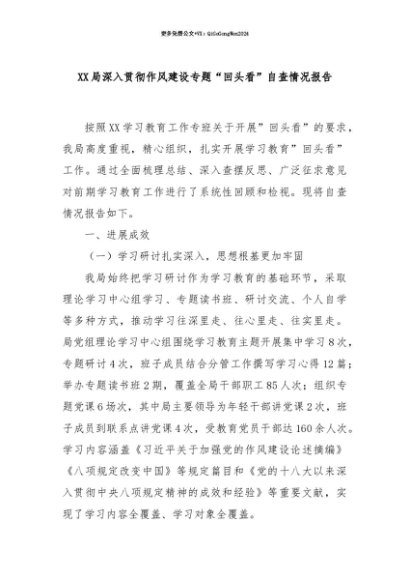 【七哥公文】2025年:【七哥公文】XX局深入贯彻作风建设专题“回头看”自查情况报告+更多免费公文+VX:QiGeGongWen2024+更多免费公文+VX:QiGeGongWen2024