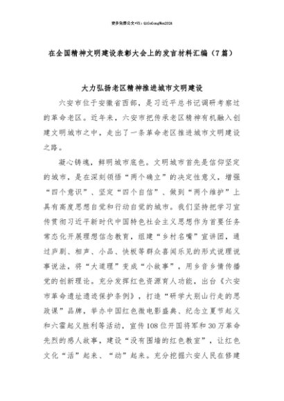 【七哥公文】2025年:【七哥公文】(7篇)在全国精神文明建设表彰大会上的发言材料汇编+更多免费公文+VX:QiGeGongWen2024+更多免费公文+VX:QiGeGongWen2024