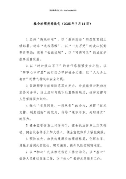 【七哥公文】2025年:【七哥公文】社会治理类排比句(2025年7月14日)+更多免费公文+VX:QiGeGongWen2024+更多免费公文+VX:QiGeGongWen2024