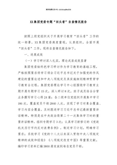 【七哥公文】2025年:【七哥公文】XX集团党委专题“回头看”自查情况报告+更多免费公文+VX:QiGeGongWen2024+更多免费公文+VX:QiGeGongWen2024