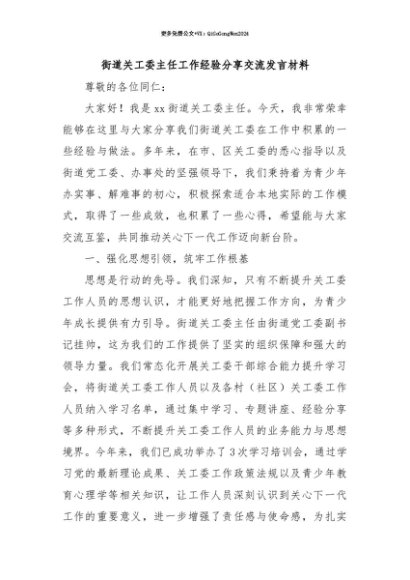 【七哥公文】2025年:【七哥公文】街道关工委主任工作经验分享交流发言材料+更多免费公文+VX:QiGeGongWen2024+更多免费公文+VX:QiGeGongWen2024
