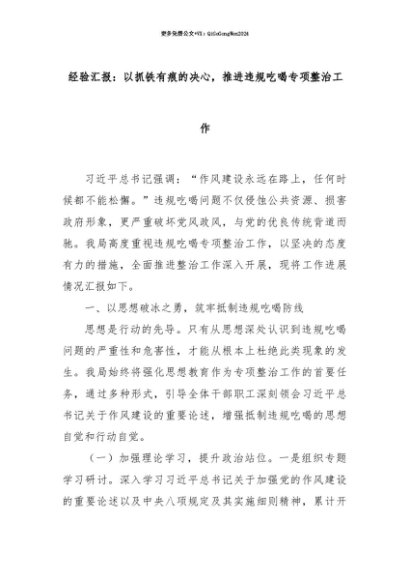 【七哥公文】2025年:【七哥公文】经验汇报:以抓铁有痕的决心,推进违规吃喝专项整治工作+更多免费公文+VX:QiGeGongWen2024+更多免费公文+VX:QiGeGongWen2024