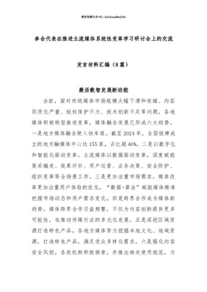 【七哥公文】2025年:【七哥公文】(8篇)参会代表在推进主流媒体系统性变革学习研讨会上的交流发言材料汇编+更多免费公文+VX:QiGeGongWen2024+更多免费公文+VX:QiGeGongWen2024