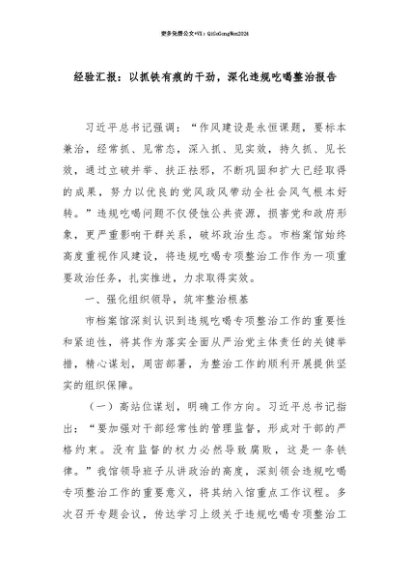 【七哥公文】2025年:【七哥公文】经验汇报:以抓铁有痕的干劲,深化违规吃喝整治报告+更多免费公文+VX:QiGeGongWen2024+更多免费公文+VX:QiGeGongWen2024