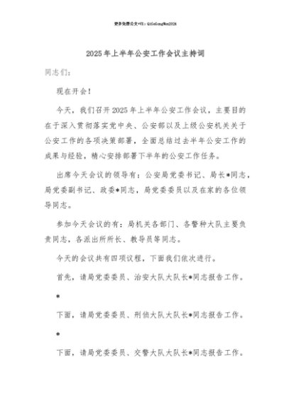 【七哥公文】2025年:【七哥公文】2025年上半年公安工作会议主持词+更多免费公文+VX:QiGeGongWen2024+更多免费公文+VX:QiGeGongWen2024