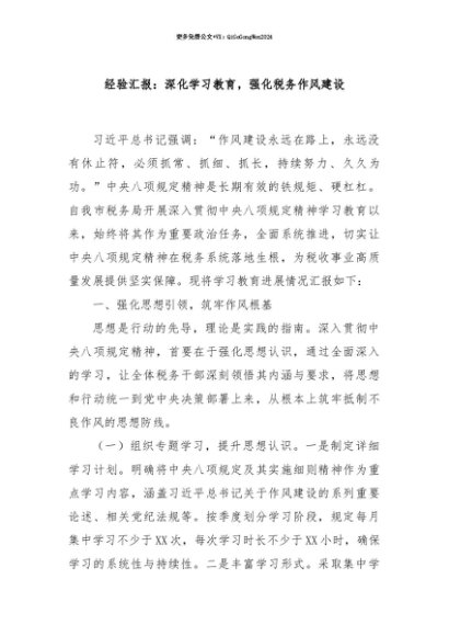 【七哥公文】2025年:【七哥公文】经验汇报:深化学习教育,强化税务作风建设+更多免费公文+VX:QiGeGongWen2024+更多免费公文+VX:QiGeGongWen2024