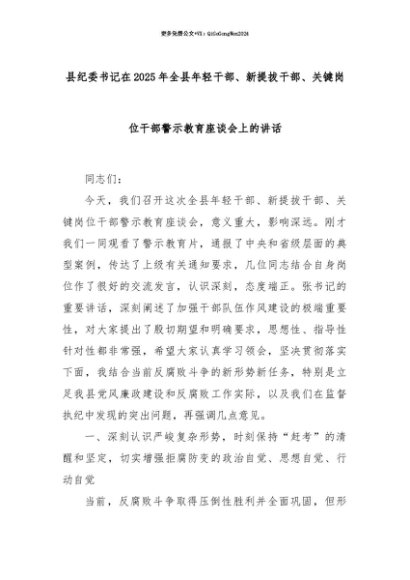 【七哥公文】2025年:【七哥公文】县纪委书记在2025年全县年轻干部、新提拔干部、关键岗位干部警示教育座谈会上的讲话+更多免费公文+VX:QiGeGongWen2024+更多免费公文+VX:QiGeGongWen2024