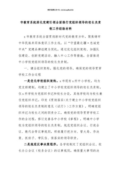 【七哥公文】2025年:【七哥公文】市教育系统深化党建引领全面推行党组织领导的校长负责制工作经验材料+更多免费公文+VX:QiGeGongWen2024+更多免费公文+VX:QiGeGongWen2024