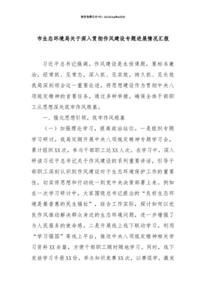 【七哥公文】2025年:【七哥公文】市生态环境局关于深入贯彻作风建设专题进展情况汇报+更多免费公文+VX:QiGeGongWen2024+更多免费公文+VX:QiGeGongWen2024
