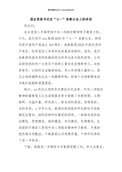 【七哥公文】2025年:【七哥公文】国企党委书记在“七一”表彰大会上的讲话+更多免费公文+VX:QiGeGongWen2024+更多免费公文+VX:QiGeGongWen2024
