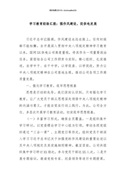 【七哥公文】2025年:【七哥公文】学习教育经验汇报:强作风建设,促供电发展+更多免费公文+VX:QiGeGongWen2024+更多免费公文+VX:QiGeGongWen2024