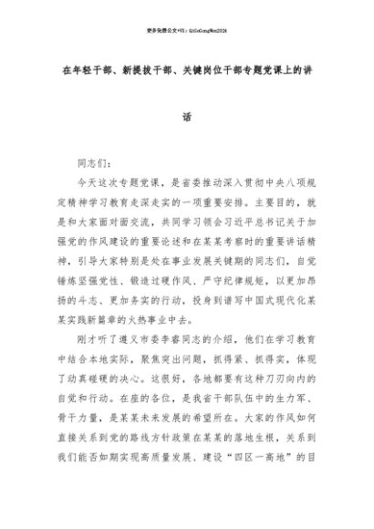 【七哥公文】2025年:【七哥公文】在年轻干部、新提拔干部、关键岗位干部专题党课上的讲话+更多免费公文+VX:QiGeGongWen2024+更多免费公文+VX:QiGeGongWen2024