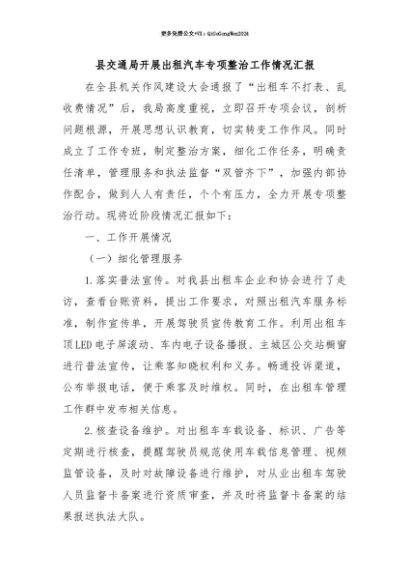 【七哥公文】2025年:【七哥公文】县交通局开展出租汽车专项整治工作情况汇报+更多免费公文+VX:QiGeGongWen2024+更多免费公文+VX:QiGeGongWen2024