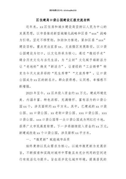 【七哥公文】2025年:【七哥公文】区住建局口袋公园建设汇报交流材料+更多免费公文+VX:QiGeGongWen2024+更多免费公文+VX:QiGeGongWen2024