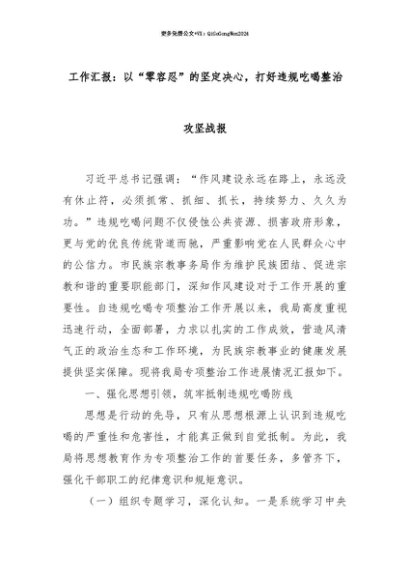 【七哥公文】2025年:【七哥公文】工作汇报:以“零容忍”的坚定决心,打好违规吃喝整治攻坚战报+更多免费公文+VX:QiGeGongWen2024+更多免费公文+VX:QiGeGongWen2024