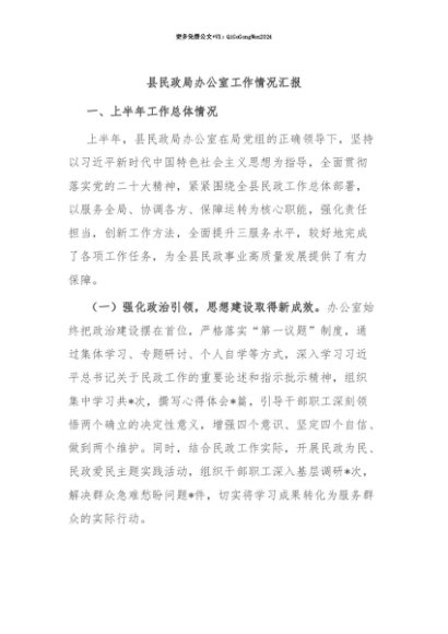 【七哥公文】2025年:【七哥公文】县民政局办公室工作情况汇报+更多免费公文+VX:QiGeGongWen2024+更多免费公文+VX:QiGeGongWen2024