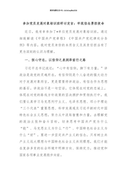 【七哥公文】2025年:【七哥公文】参加党员发展对象培训班研讨发言:牢筑信念勇担使命+更多免费公文+VX:QiGeGongWen2024+更多免费公文+VX:QiGeGongWen2024
