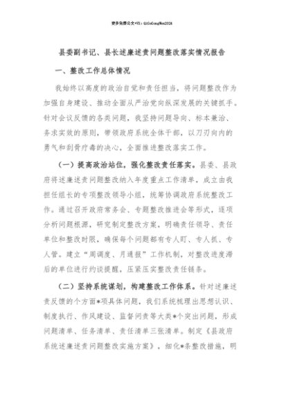 【七哥公文】2025年:【七哥公文】县委副书记、县长述廉述责问题整改落实情况报告+更多免费公文+VX:QiGeGongWen2024+更多免费公文+VX:QiGeGongWen2024