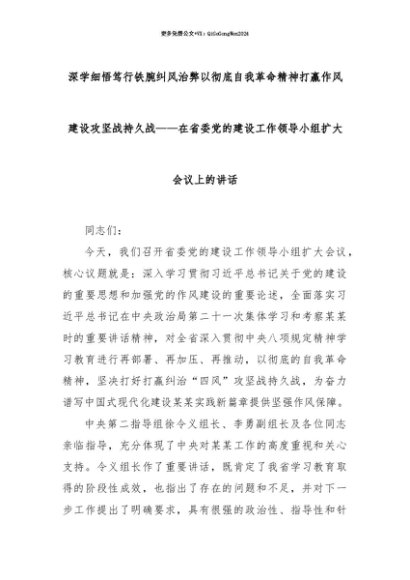 【七哥公文】2025年:【七哥公文】深学细悟笃行铁腕纠风治弊以彻底自我革命精神打赢作风建设攻坚战持久战——在省委党的建设工作领导小组扩大会议上的讲话+更多免费公文+VX:QiGeGongWen2024+更多免费公文+VX:QiGeGongWen2024