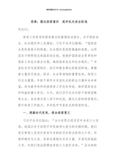 【七哥公文】2025年:【七哥公文】党课:强化保密意识 筑牢机关安全防线+更多免费公文+VX:QiGeGongWen2024+更多免费公文+VX:QiGeGongWen2024