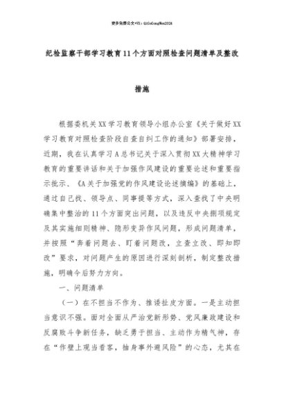 【七哥公文】2025年:【七哥公文】纪检监察干部学习教育11个方面对照检查问题清单及整改措施+更多免费公文+VX:QiGeGongWen2024+更多免费公文+VX:QiGeGongWen2024