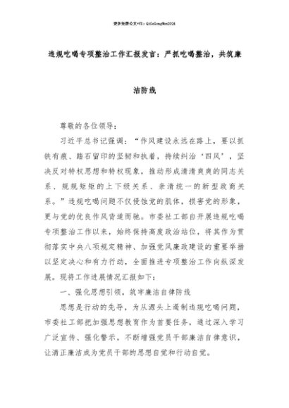 【七哥公文】2025年:【七哥公文】违规吃喝专项整治工作汇报发言:严抓吃喝整治,共筑廉洁防线+更多免费公文+VX:QiGeGongWen2024+更多免费公文+VX:QiGeGongWen2024