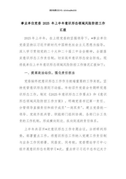 【七哥公文】2025年:【七哥公文】事业单位党委 2025 年上半年意识形态领域风险防控工作汇报+更多免费公文+VX:QiGeGongWen2024+更多免费公文+VX:QiGeGongWen2024