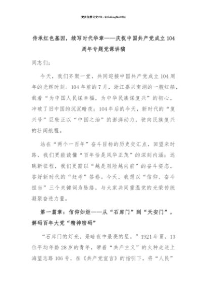 【七哥公文】2025年:【七哥公文】传承红色基因,续写时代华章——庆祝中国共产党成立104周年专题党课讲稿+更多免费公文+VX:QiGeGongWen2024+更多免费公文+VX:QiGeGongWen2024