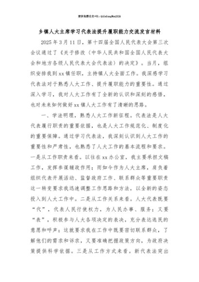 【七哥公文】2025年:【七哥公文】乡镇人大主席学习代表法提升履职能力交流发言材料+更多免费公文+VX:QiGeGongWen2024+更多免费公文+VX:QiGeGongWen2024