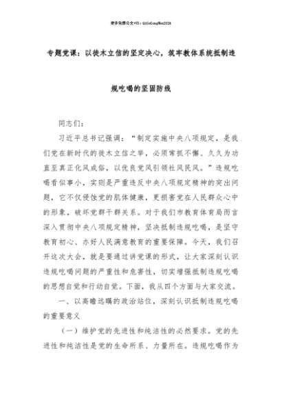 【七哥公文】2025年:【七哥公文】专题党课:以徙木立信的坚定决心,筑牢教体系统抵制违规吃喝的坚固防线+更多免费公文+VX:QiGeGongWen2024+更多免费公文+VX:QiGeGongWen2024