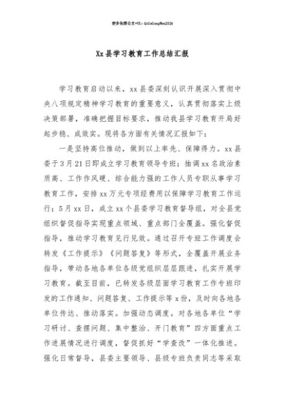 【七哥公文】2025年:【七哥公文】Xx县学习教育工作总结汇报+更多免费公文+VX:QiGeGongWen2024+更多免费公文+VX:QiGeGongWen2024