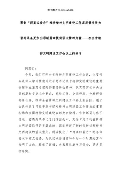 【七哥公文】2025年:【七哥公文】聚焦“两高四着力”推动精神文明建设工作高质量发展为谱写某某更加出彩新篇章提供强大精神力量——在全省精神文明建设工作会议上的讲话+更多免费公文+VX:QiGeGongWen2024+更多免费公文+VX:QiGeGongWen2024