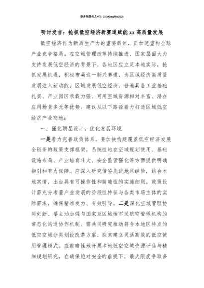 【七哥公文】2025年:【七哥公文】研讨发言:抢抓低空经济新赛道赋能xx高质量发展+更多免费公文+VX:QiGeGongWen2024+更多免费公文+VX:QiGeGongWen2024