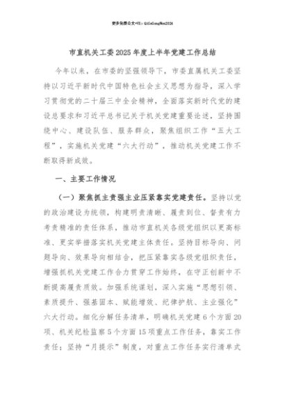 【七哥公文】2025年:【七哥公文】市直机关工委2025年度上半年党建工作总结+更多免费公文+VX:QiGeGongWen2024+更多免费公文+VX:QiGeGongWen2024