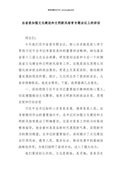 【七哥公文】2025年:【七哥公文】在省委加强文化建设和文明新风培育专题会议上的讲话+更多免费公文+VX:QiGeGongWen2024+更多免费公文+VX:QiGeGongWen2024