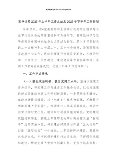 【七哥公文】2025年:【七哥公文】某审计局2025年上半年工作总结及2025年下半年工作计划+更多免费公文+VX:QiGeGongWen2024+更多免费公文+VX:QiGeGongWen2024