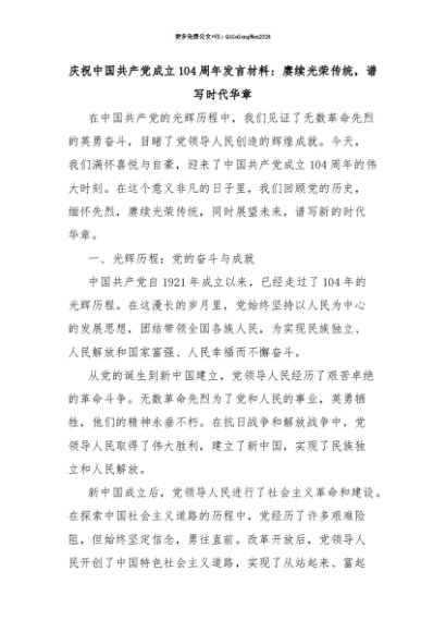 【七哥公文】2025年:【七哥公文】庆祝中国共产党成立104周年发言材料:赓续光荣传统,谱写时代华章+更多免费公文+VX:QiGeGongWen2024+更多免费公文+VX:QiGeGongWen2024