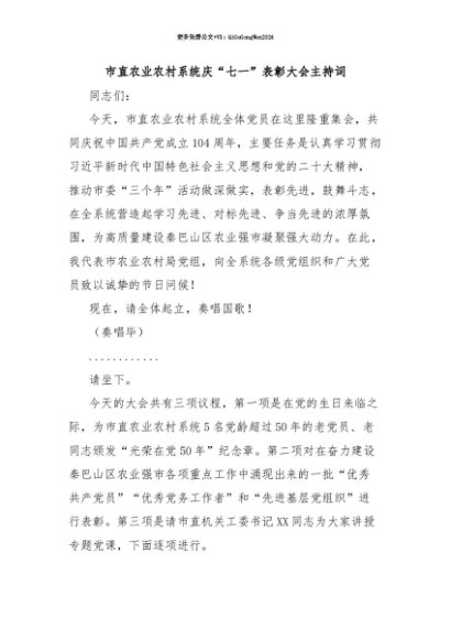 【七哥公文】2025年:【七哥公文】市直农业农村系统庆“七一”表彰大会主持词+更多免费公文+VX:QiGeGongWen2024+更多免费公文+VX:QiGeGongWen2024