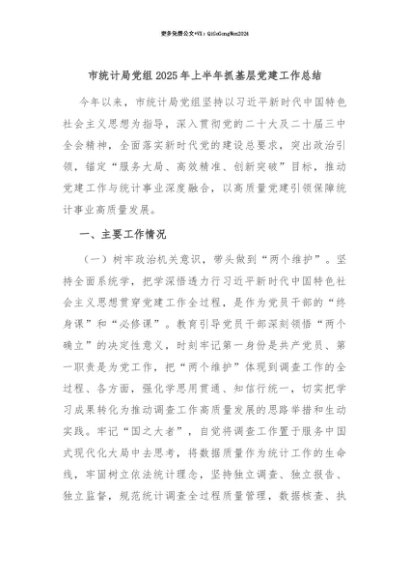 【七哥公文】2025年:【七哥公文】市统计局党组2025年上半年抓基层党建工作总结+更多免费公文+VX:QiGeGongWen2024+更多免费公文+VX:QiGeGongWen2024
