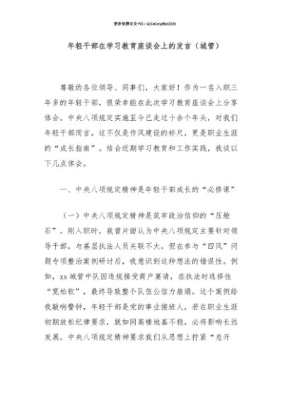 【七哥公文】2025年:【七哥公文】年轻干部在学习教育座谈会上的发言(城管)+更多免费公文+VX:QiGeGongWen2024+更多免费公文+VX:QiGeGongWen2024