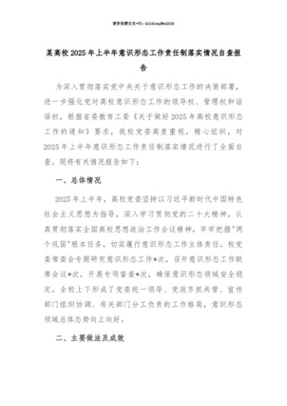 【七哥公文】2025年:【七哥公文】某高校2025年上半年意识形态工作责任制落实情况自查报告+更多免费公文+VX:QiGeGongWen2024+更多免费公文+VX:QiGeGongWen2024