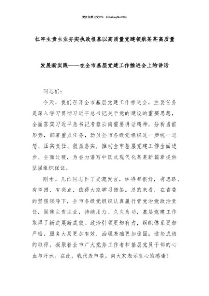 【七哥公文】2025年:【七哥公文】扛牢主责主业夯实执政根基以高质量党建领航某某高质量发展新实践——在全市基层党建工作推进会上的讲话+更多免费公文+VX:QiGeGongWen2024+更多免费公文+VX:QiGeGongWen2024