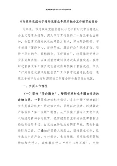 【七哥公文】2025年:【七哥公文】市财政局党组关于推动党建业务深度融合工作情况的报告+更多免费公文+VX:QiGeGongWen2024+更多免费公文+VX:QiGeGongWen2024