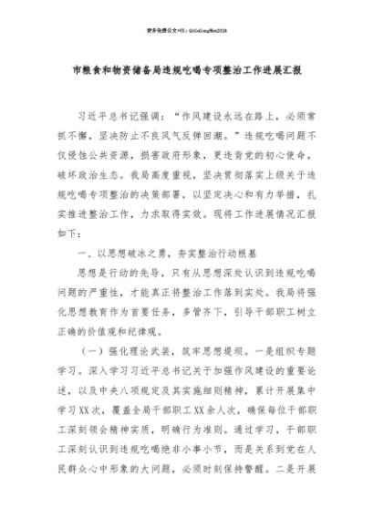 【七哥公文】2025年:【七哥公文】市粮食和物资储备局违规吃喝专项整治工作进展汇报+更多免费公文+VX:QiGeGongWen2024+更多免费公文+VX:QiGeGongWen2024