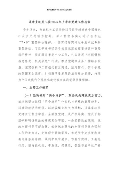 【七哥公文】2025年:【七哥公文】某市直机关工委2025年上半年党建工作总结+更多免费公文+VX:QiGeGongWen2024+更多免费公文+VX:QiGeGongWen2024