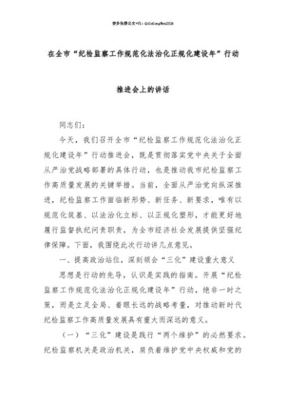 【七哥公文】2025年:【七哥公文】在全市“纪检监察工作规范化法治化正规化建设年”行动推进会上的讲话+更多免费公文+VX:QiGeGongWen2024+更多免费公文+VX:QiGeGongWen2024