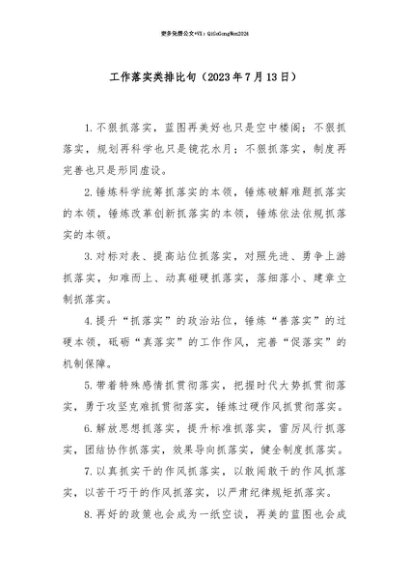 【七哥公文】2025年:【七哥公文】工作落实类排比句(2025年7月13日)+更多免费公文+VX:QiGeGongWen2024+更多免费公文+VX:QiGeGongWen2024