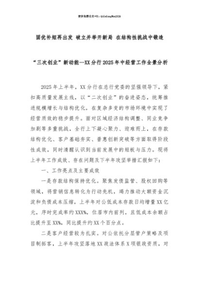 【七哥公文】2025年:【七哥公文】固优补短再出发 破立并举开新局 在结构性挑战中锻造“三次创业”新动能—XX分行2025年中经营工作全景分析+更多免费公文+VX:QiGeGongWen2024+更多免费公文+VX:QiGeGongWen2024